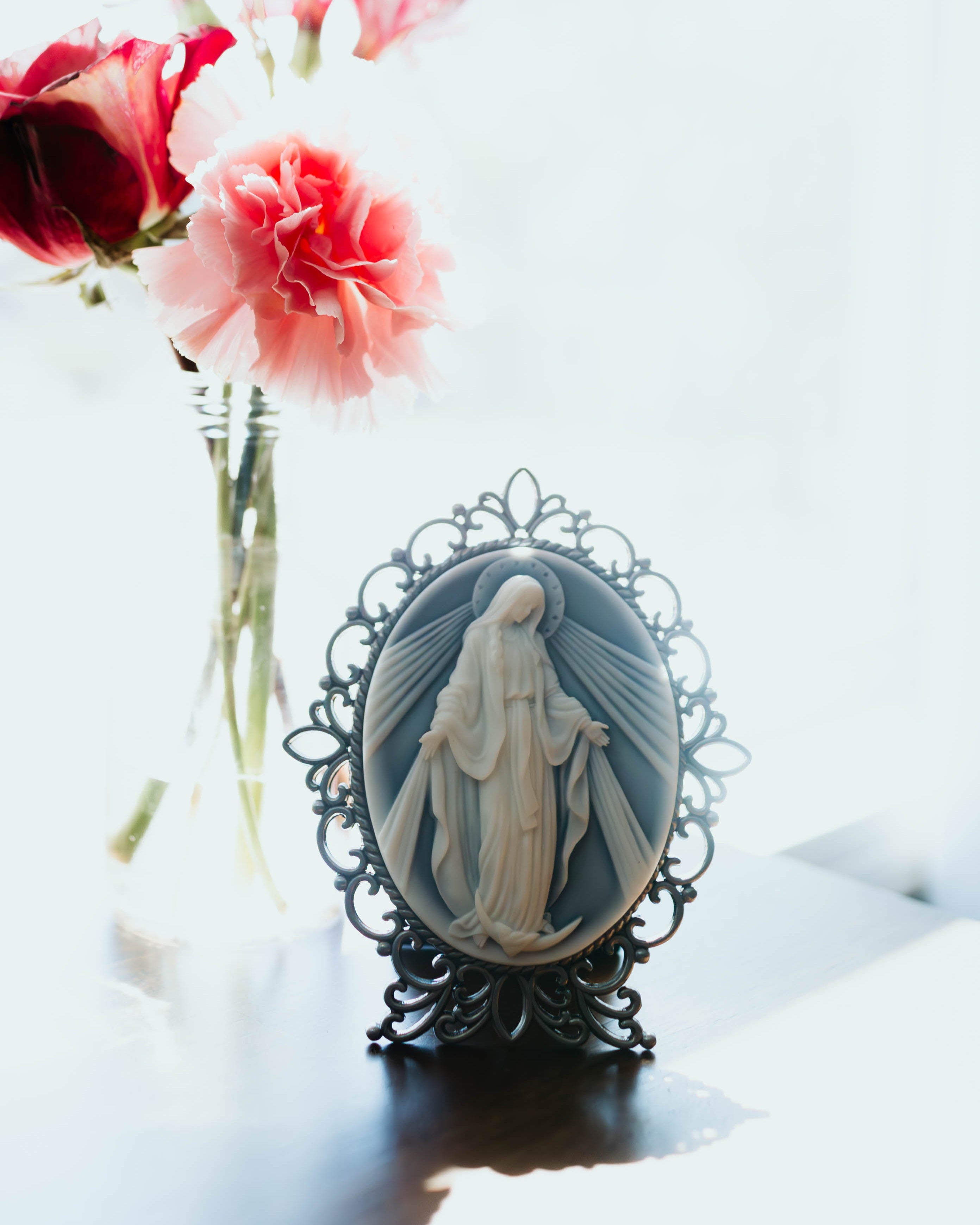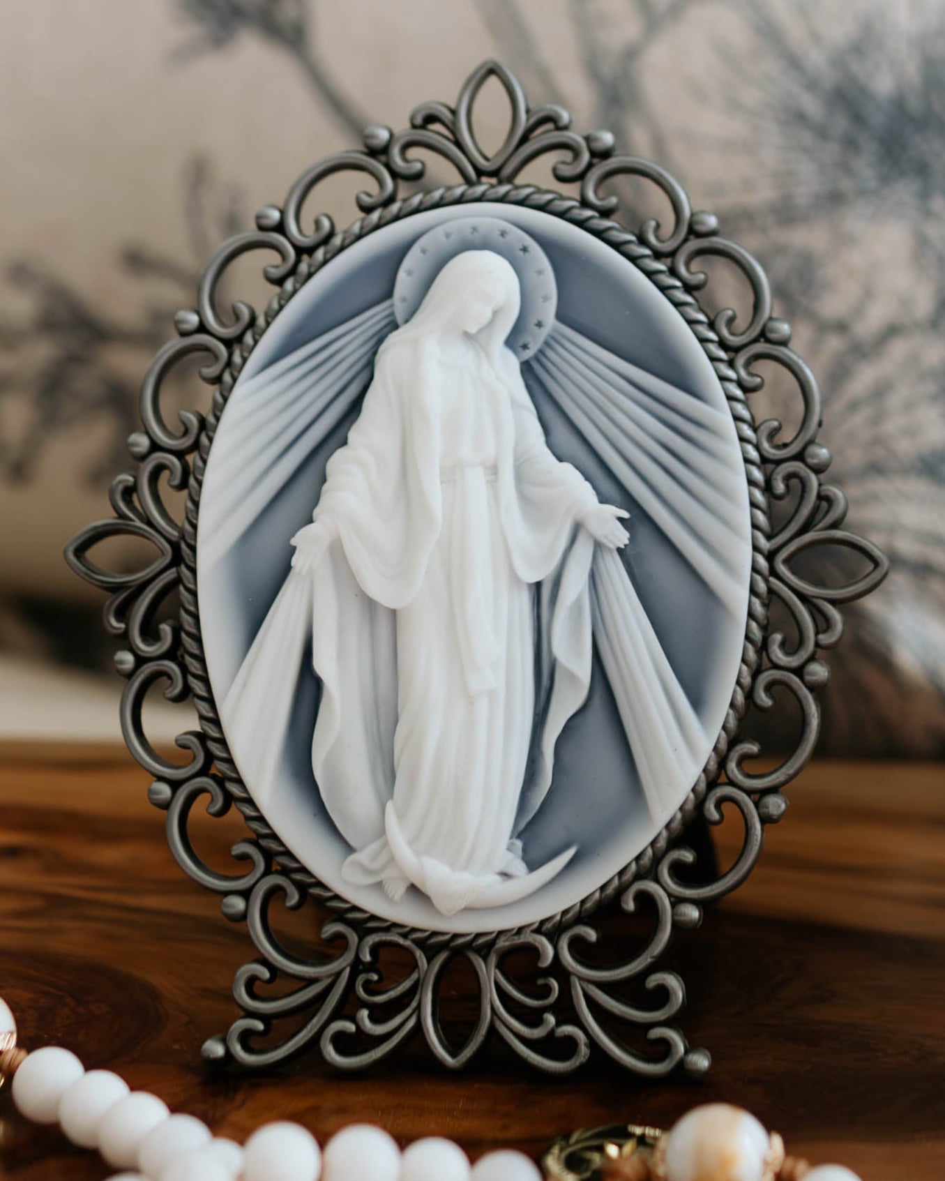This cameo desk stand is a beautiful addition to any space, reminding us to call on Mary, our spiritual mother, as she points us toward Christ. With soft blues and vintage style details, this piece serves as a daily invitation to pause, pray, and rest in the comfort of Our Lady's intercession.